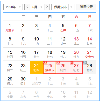 放假時間:2020年6月25日(周四)——2020年6月27日(周六),共三天。