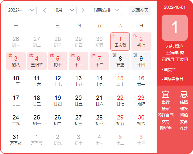 放假時(shí)間:2022年10月01日(周六)——2022年10月07日(周五),共七天。